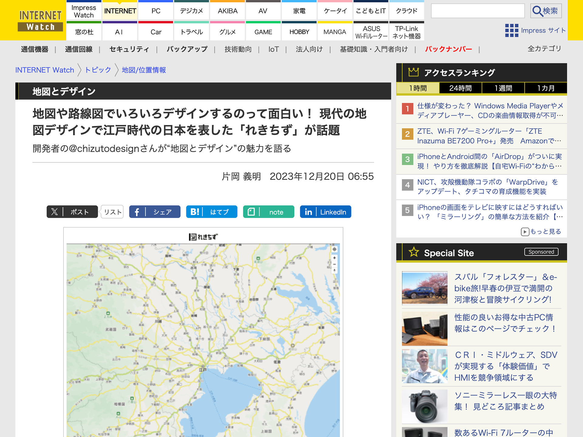 Internet Watchにて、ロングインタビュー記事が掲載されました。電力系統路線図から始まった活動の歩み、路線図や時間をテーマにした作品群の制作意図、そして「れきちず」の開発背景まで、これまでの活動を幅広く取り上げていただきました。