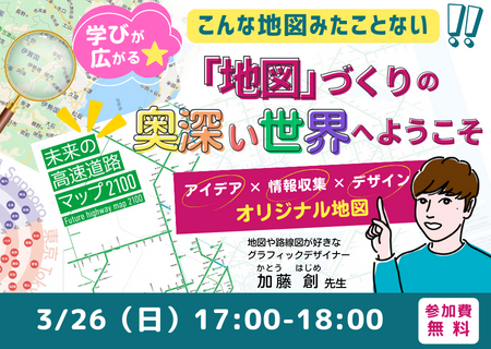 キッズウィークエンド株式会社主催の「小学生のためのオンライン春フェス2023」に講師として登壇。小学校中学年以上を対象に、地図・路線図の作品を紹介しながら、身の回りの情報をリサーチし、まとめ、わかりやすく見せるプロセスについて話した。2023年3月26日開催。