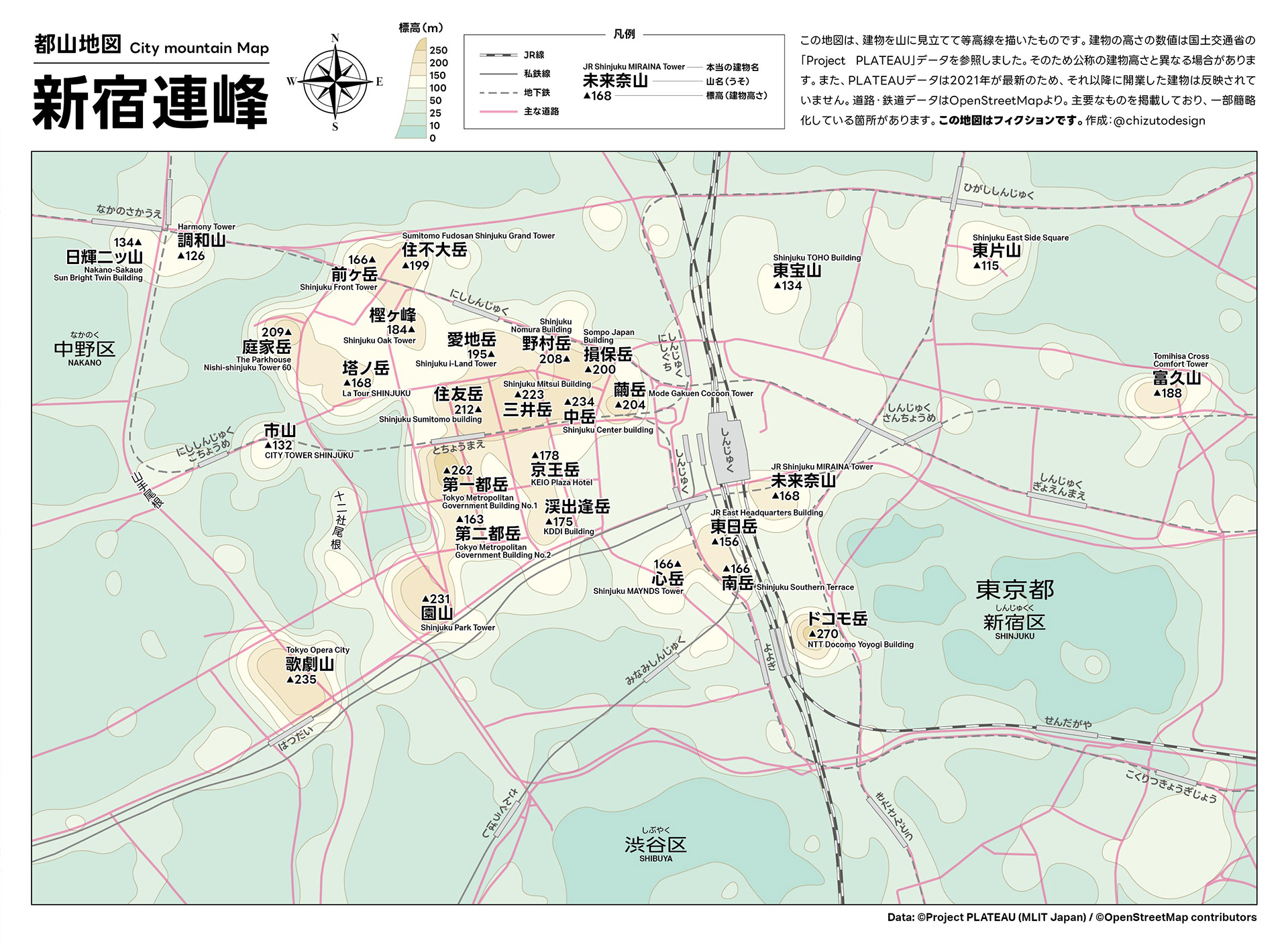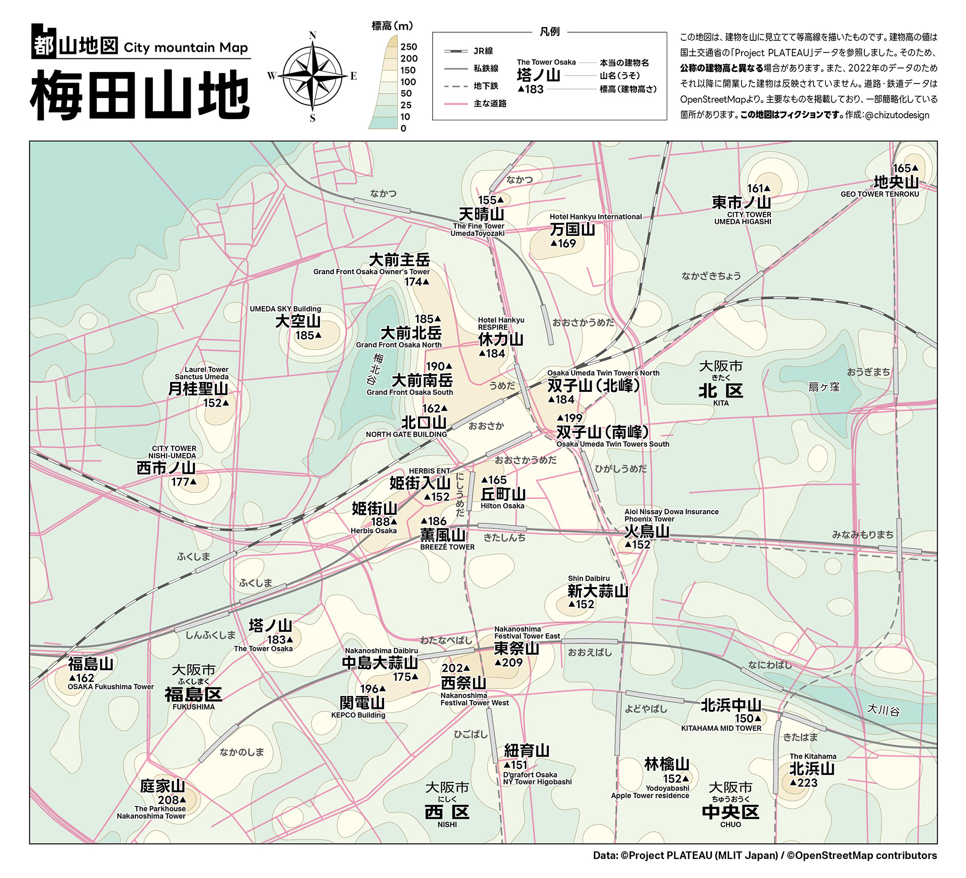 東京・新宿と大阪・梅田の高層ビル群の高さを山に見立て登山風地図にしました。/ Mountain-climbing style map depicting the skyscrapers of Tokyo's Shinjuku and Osaka's Umeda as mountains