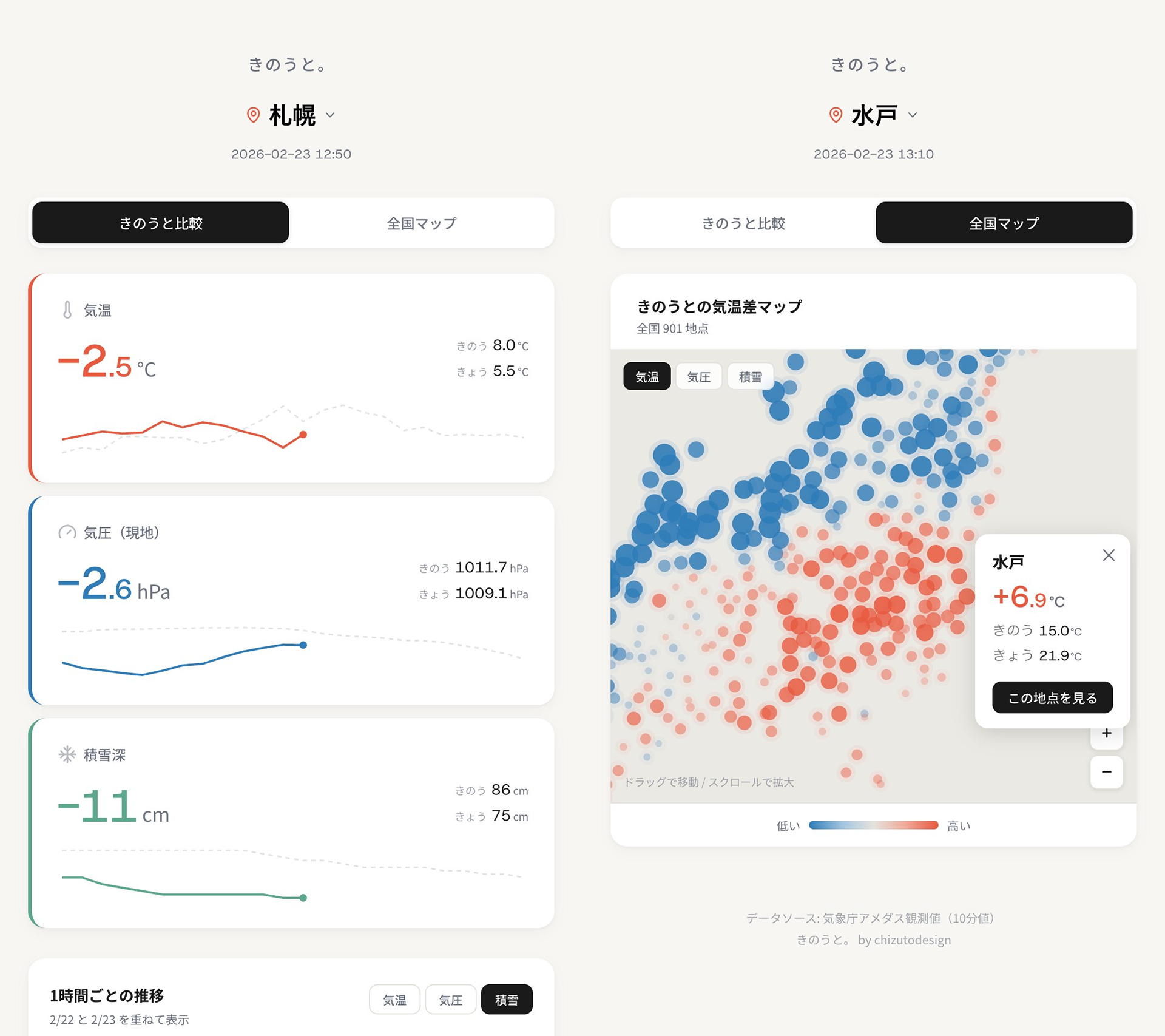 きのう(昨日)の天気と比較できるWebサイト。「今日は昨日より暑い?寒い?」という日常の素朴な疑問を、気象庁アメダスの10分値データを使って可視化した。全国のアメダス地点に対応しており、気温・気圧・風速・湿度・積雪を比較できる。全国マップでのきのうとの気温差表示も搭載。最低/最高気温との比較はよく見るが、「今この時刻の昨日との差」がわかるのが特徴で、「服装選びに使える」という声をいただいている。