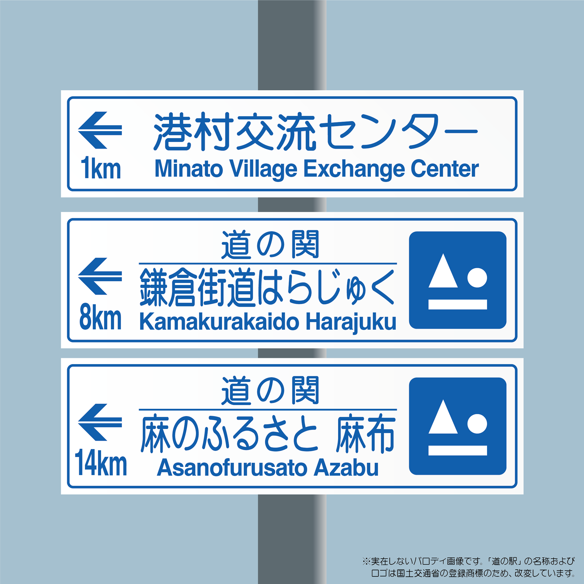 現代の「道の駅」風の看板で、東京の地名を案内してみた作品(「道の駅」の名称とロゴは国土交通省の登録商標のため改変している)。麻布は「麻のふるさと」、原宿は「鎌倉街道はらじゅく」——いまやブランドとなった地名も、字面だけ見ると驚くほどのどか。